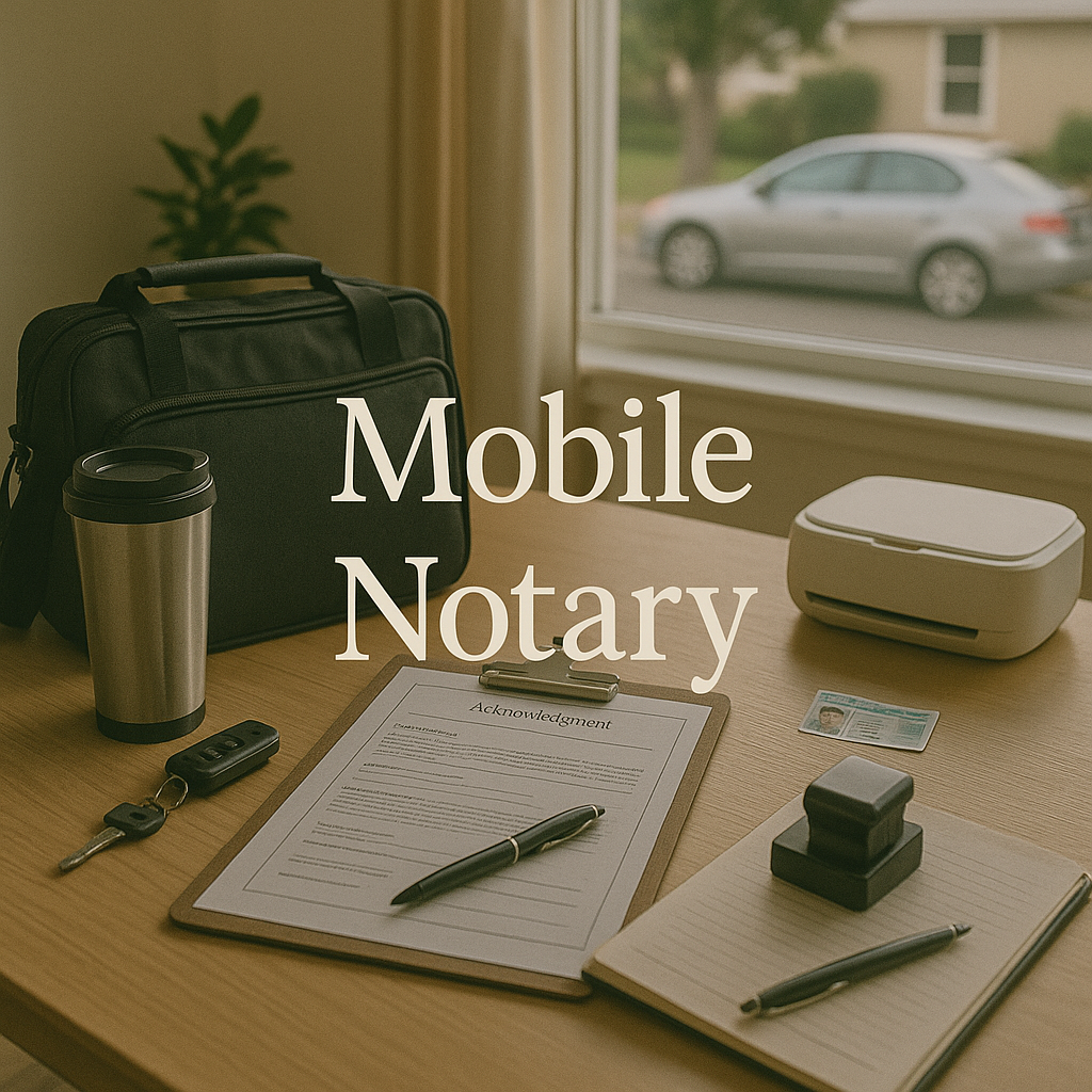 Get documents notarized via a secure audio-video session—nationwide, in jurisdictions that allow RON (currently 47 states + D.C.). You’ll need a valid government ID, webcam, and stable internet; I handle identity proofing and deliver a digitally sealed copy right away. - Mobile Notary (from $35)